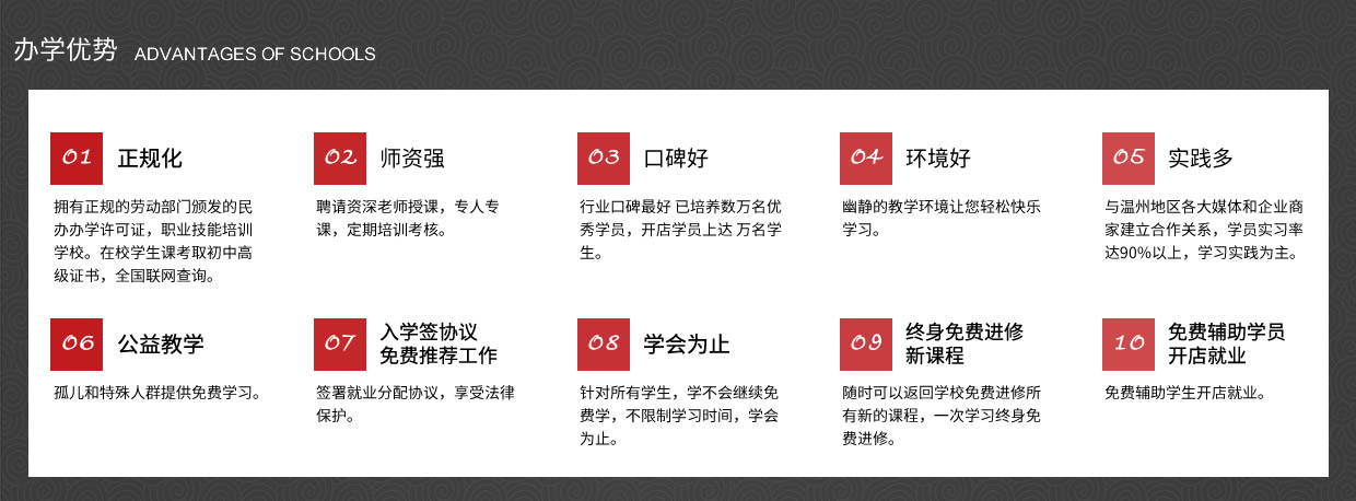 我校以培養(yǎng)實(shí)用型專業(yè)人才為目標(biāo),理論學(xué)習(xí)、操作訓(xùn)練與專業(yè)實(shí)踐三位一體,實(shí)行一對一的教學(xué)模式,常年招生,男女不限。畢業(yè)后推薦工作、 主要是以理論為輔實(shí)操為主的教學(xué)模式授課。老師手把手教、一對一輔導(dǎo),為學(xué)員量身定做課程,保證學(xué)會為止、 中途不收取任何費(fèi)用,(無任何隱形消費(fèi))進(jìn)修新的課程。、簽約教學(xué)、幫助學(xué)員開店就業(yè),免費(fèi)試學(xué)(讓您全方位的體驗(yàn)我們的專業(yè)、讓你不花一分冤枉錢。)